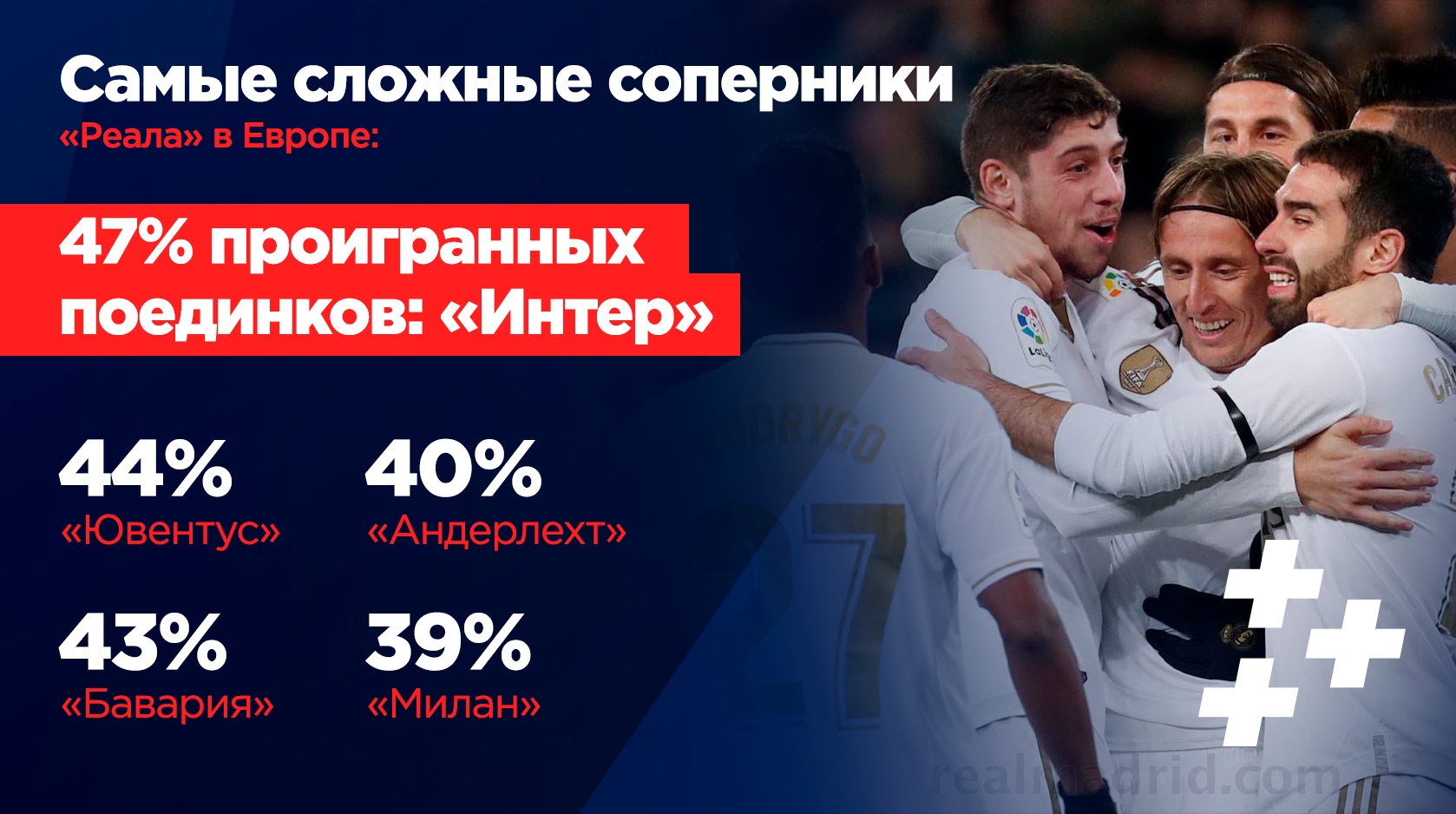 Есть ли у "Мадрида" соперник, с которым присутствует отрицательная разница выигранных и проигранных поединков в Европе? Да. Это "Челси" (67% проигранных матчей) и "Абердин" (100% проигранных матчей), но с ними клуб из столицы Испании не провел 10 необходимых для нашей выборки поединков.