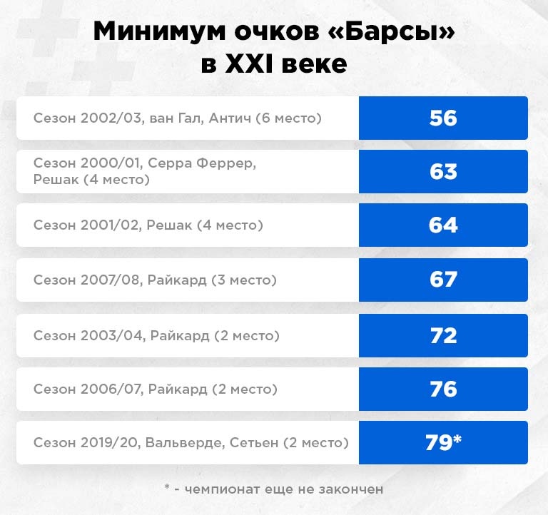Восхищаясь командой, по-военному выстроенной Зинедином Зиданом, нельзя не отметить и зыбкие пески, в которые угодила "Барселона". У каталонского клуба оказалось столько проблем – с менеджментом, с деньгами, с сенаторами, с тренерами, и даже с компаниями, генерирующими мемы в социальных сетях, - что все это, естественно, сильно влияло на результат. После паузы в первенстве "Реал" выиграл 10 матчей из 10-ти, у "Барселоны" в таком же количестве поединков – 3 ничьи и поражение. Там, где "Мадрид" брал характером, блаугранас сбивались на хаотичные перемещения в поисках Лионеля Месси. От "Сельты" Кике Тим пропустила на 88-й минуте, упустив таким образом победу; игравшая вдесятером "Осасуна" торпедировала "Барсу" на третьей добавленной, оформив сенсационную победу на "Камп Ноу".