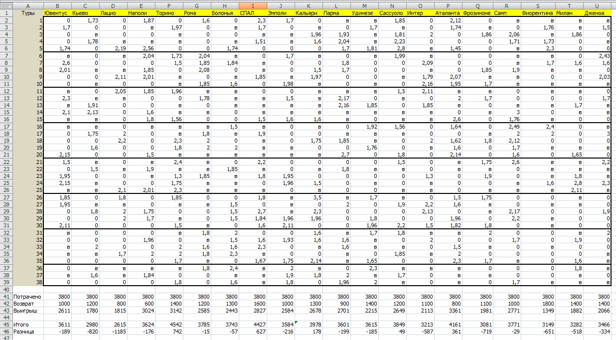 Прибыль и потери остальных команд стремятся к нулевой отметке с разных полюсов, рассматривать их просто нет смысла. Друзья, не вздумайте применять этот эксперимент на командах-лидерах национальных первенств, это не принесет вам никакой радости, но зато можно поискать надежных поставщиков среди крепких орешков.