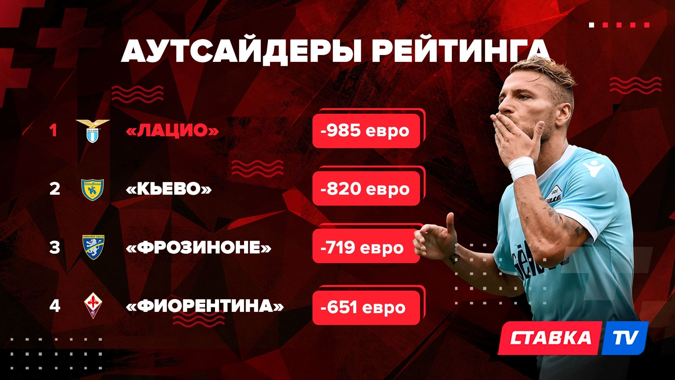 Особняком среди всех этих дармоедов стоит римский “Лацио”. “Орлы” в сезоне минувшем пробили фору лишь девять раз, имея попутно еще 20 неудачных исходов. Как же так получилось? Будучи одним из фаворитов лиги (если не брать в учет монументальность “Ювентуса”), подопечные Симоне Индзаги угодили в откровенно кризисный сезон. Им удалось взять Кубок Италии, одолев в финальном матче выскочек из Бергамо, но в чемпионате дела шли ужасно. Атакующая игра команды пострадала, а вместе с ней и стабильность результатов. В прошлом сезоне “Лацио” очень тяжело давались минусовые форы. Итог: лишь восьмое место в первенстве, а в нашем денежном рейтинге −820 евро, что равняется почетному последнему месту.