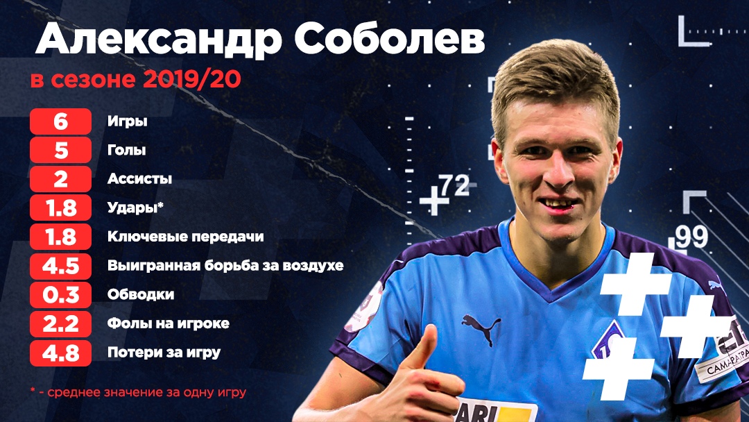 Соболев заставляет соперников нарушать правила (около 3 фолов за игру) и выигрывает около 50% верховых единоборств. Но при этом нападающему нужно прибавлять в контроле мяча, ведь сейчас у страйкера 4,8 неудачных касаний за матч, а это дико много. Александр с отрывом худший по этому показателю, опережая Николу Влашича из ЦСКА (3,7). Но звезда ЦСКА в три раза чаще пускается в дриблинг (3,8 против 0,3 у Соболева), поэтому такая его статистика предельно понятна. Несмотря на то, что форвард “Крыльев” лидирует в списке бомбардиров, ему не хватает агрессии и нацеленности на ворота (лишь 1,8 ударов за 90 минут). Сейчас у Соболева залетает все, но как долго это продлится – большой вопрос.