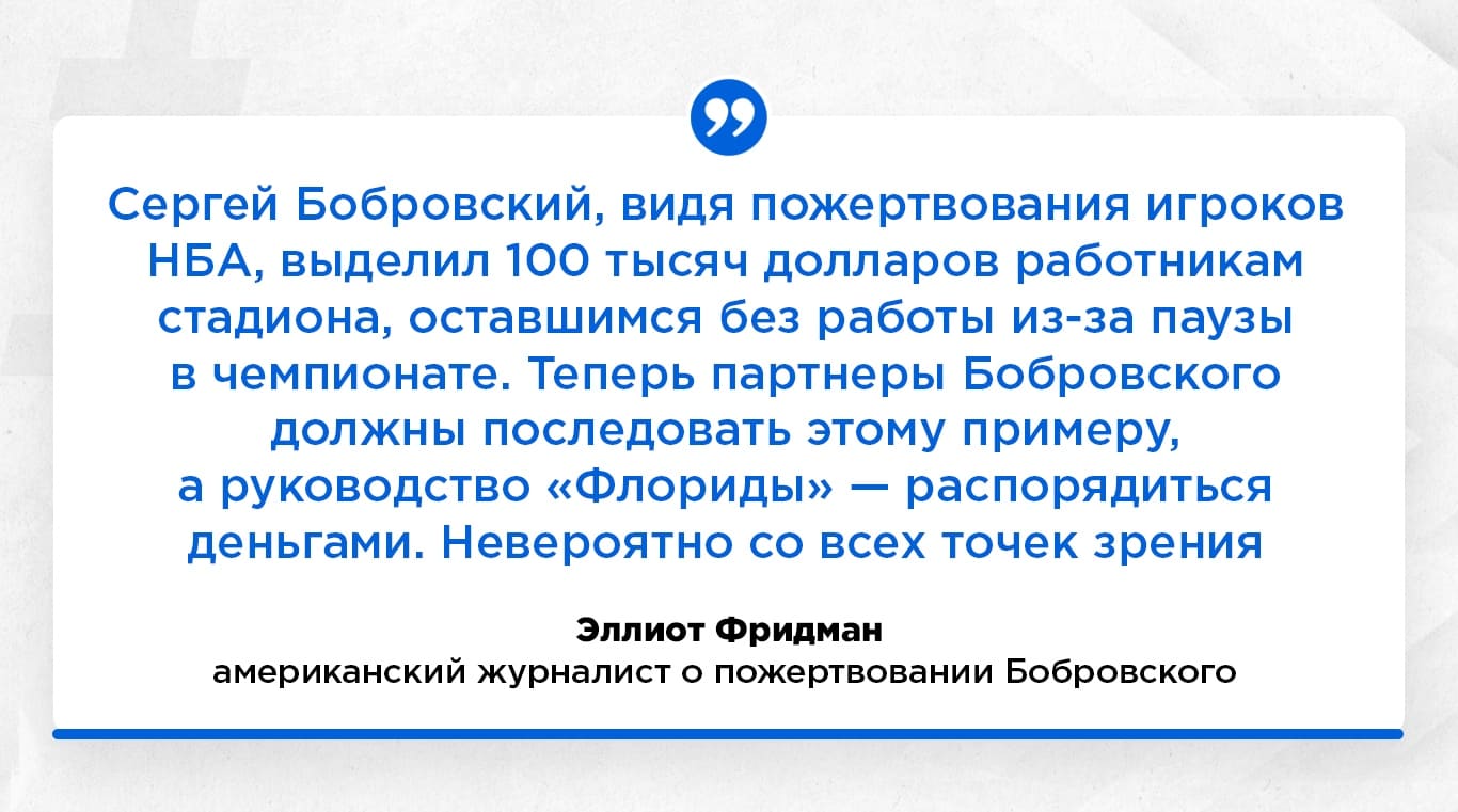 Бобровский проводит не лучший свой сезон в НХЛ, но фанаты "Флориды" готовы носить его на руках за помощь работникам стадиона. В принципе, можно даже сказать, что именно с Сергея началась подобная практика. Сначала спортсмены жертвовали деньги работникам клуба, уже после этого руководство стало сокращать зарплаты игрокам. За счет этого сотрудники академий и стадионов сейчас получают зарплату.