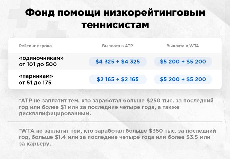 Еще в начале апреля 371-я ракетка мира София Шапатова написала открытое письмо, в котором просила ITF, ATP, WTA оказать финансовую помощь низкорейтинговым игрокам. После многочисленных ответов, что “теннисисты не являются их сотрудниками и они не должны им помогать” организаторы “Больших Шлемов”, а также главы АТР, WTA и ITF всё же создали фонд поддержки игроков во время пандемии коронавируса.