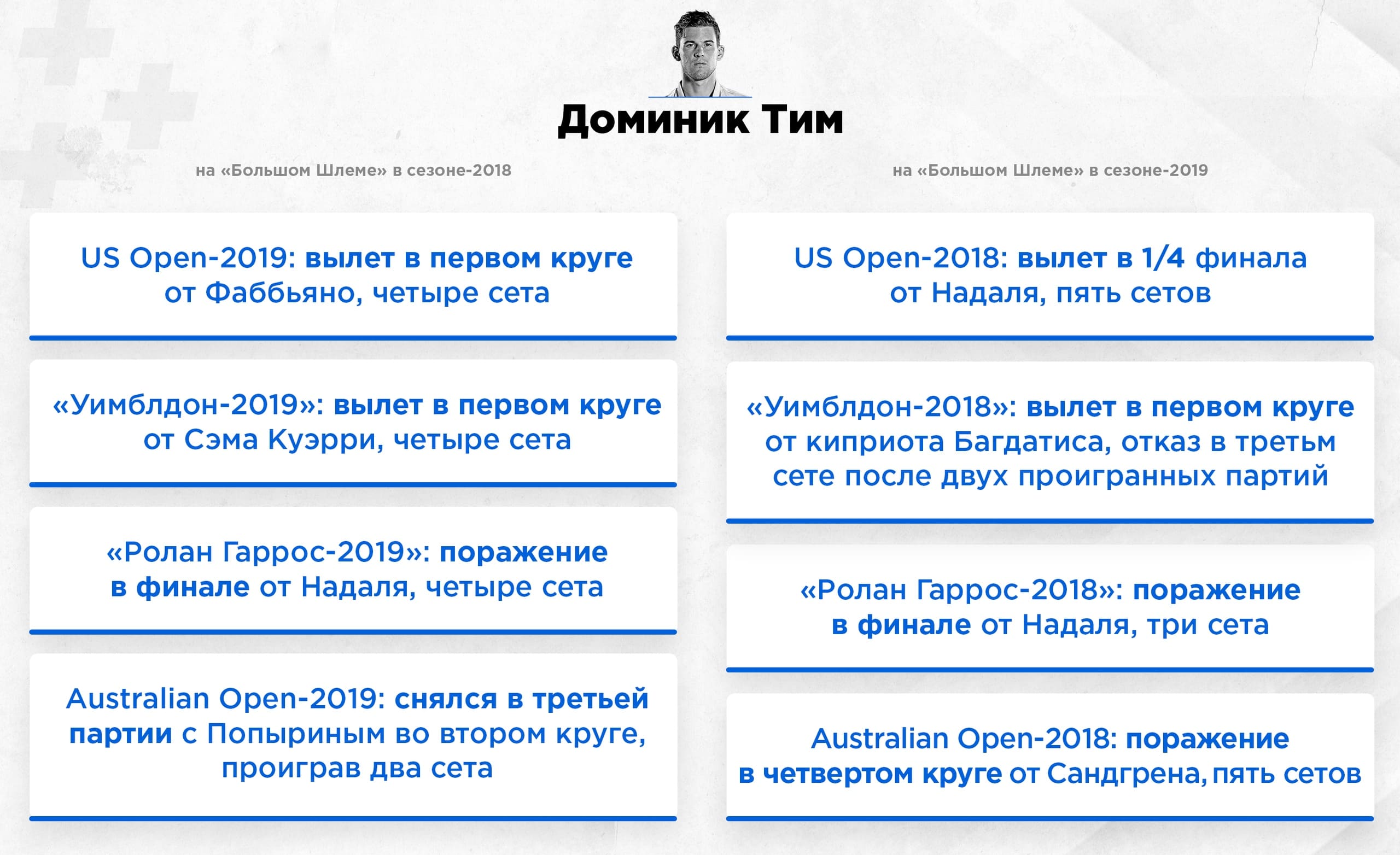 Именно с приходом Массу результаты австрийца улучшились, и он провел лучший сезон в карьере. В 2019-м Доминик завоевал сразу пять титулов (Индиан-Уэллс, Барселона, Кицбюэль, Пекин и Вена) и закончил год в топ-4. Он уже давно научился обыгрывать топов: в свое время уничтожил Джоковича в 1/4 финала “Ролан Гаррос” (7:5, 6:3, 6:0), уводил титулы у Надаля на грунте Буэнос-Айреса и Барселоны, а Федерера побеждал в финале Индиан-Уэллса. Причем победы над Рафой, Роджером и Новаком – не разовая история. С Надалем у Тима счет личных встреч 5:9, с Роджером – 5:2, с Ноле – 4:6. Главная проблема даже не в этих ребятах. Как показал опыт предыдущих матчей, стабильно и на хорошем уровне гонять с ними Доминик способен.