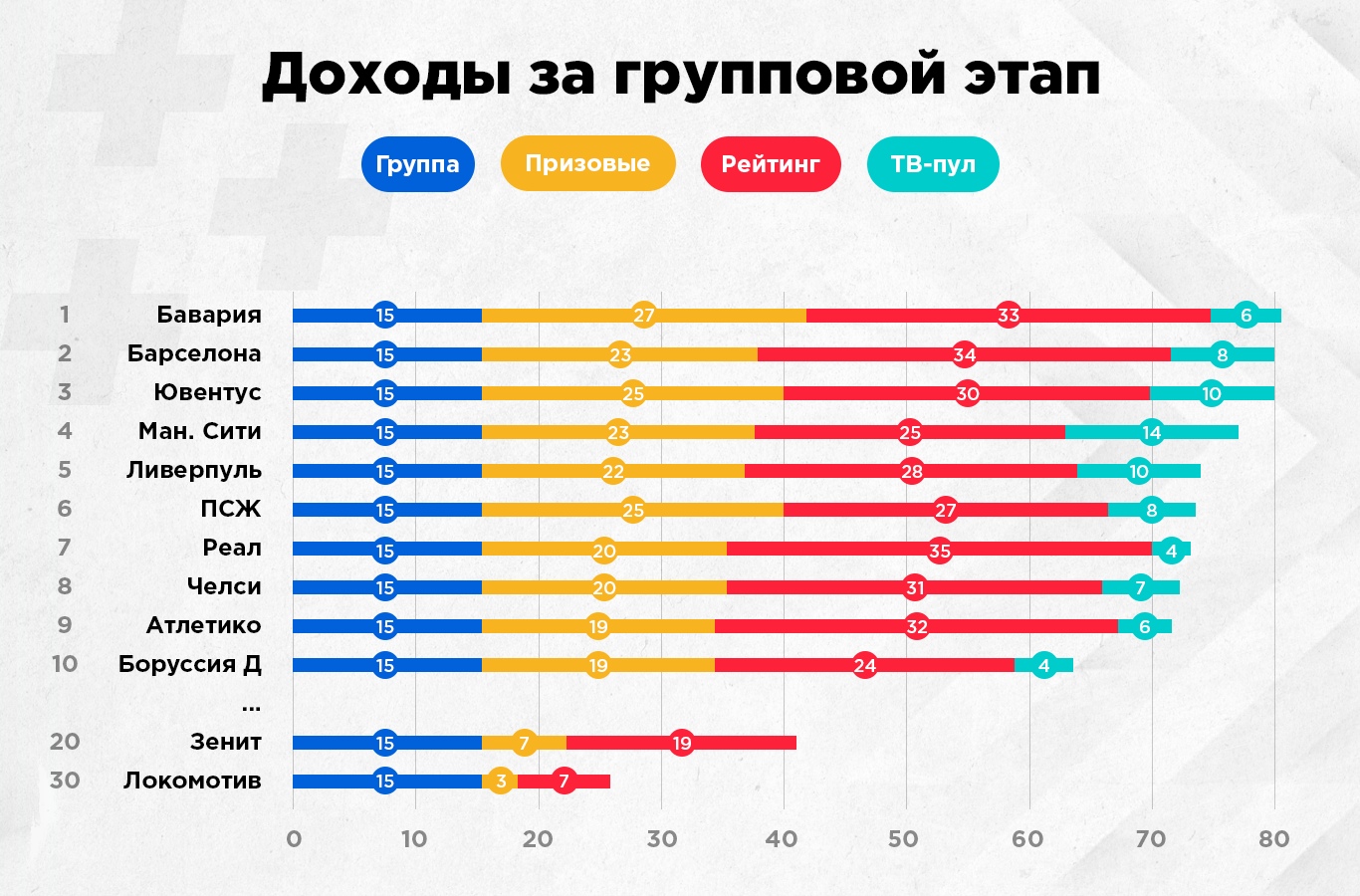 Обратим внимание на Россию. В групповом этапе Лиги чемпионов нашу страну представляли только "Зенит" и "Локомотив". Питерский клуб заработал почти вдвое больше, нежели "железнодорожники" (€41 млн. против €25 млн.). И несмотря на то, что пока нет данных о доходах с продажи телевизионных прав в России, "Локомотив" оказался третьим с конца по заработанным средствам, обогнав лишь белградский "Партизан" и пражскую "Славию".
