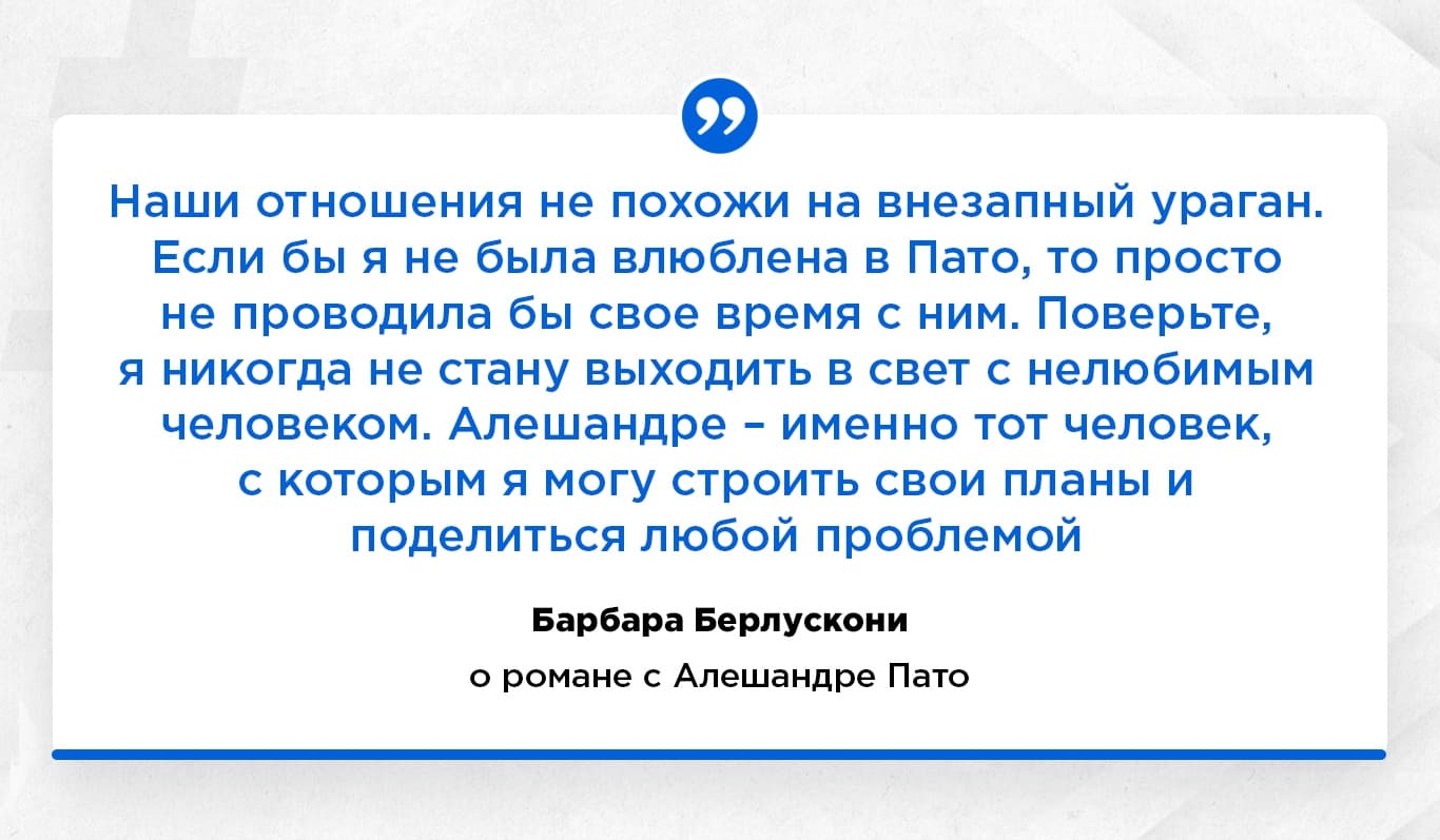 Большие деньги и популярность могут сыграть злую шутку с игроками. Стефани Бриту, первая жена Алешандре Пато, обращалась в суд по неуплате футболистом алиментов. Одной из причин, по которой их брак распался, Стефани называла постоянные вечеринки Алешандре: "Он редко появлялся дома. Большую часть времени он играл, тренировался и отдыхал в клубах". Видимо, на одной из вечеринок Пато и встретил Барбару Берлускони - дочь Сильвио Берлускони, президента "Милана".