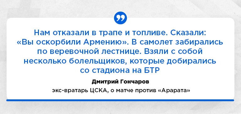 Армейцы кое-как добежали до раздевалки, вырвали душевые трубы и готовились к обороне. Болельщики "Арарата" в это время крушили автобус ЦСКА и охотились на приезжих фанатов. Когда страсти поутихли, армейцы покинули стадион в сопровождении нескольких БТР. Покинуть Армению оказалось не так просто – работники аэропорта принципиально не давали разрешения на взлет.