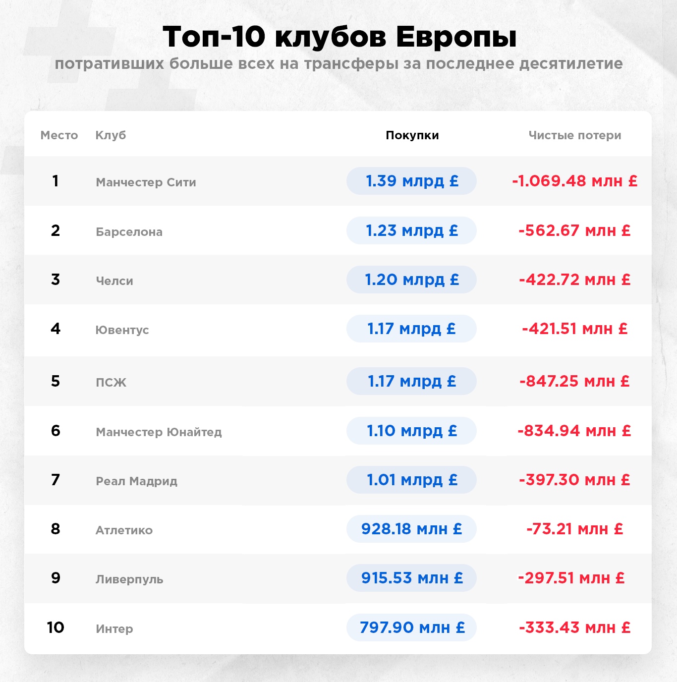 Подобные расходы могут позволить себе исключительно клубы из топ-первенств Европы. "Богатый нефтью" "Манчестер Сити" завершил последний десятилетний цикл на вершине списка самых тратящих команд. Горожане провели 255 входящих трансферов на общую сумму 1 млрд. 390 млн. фунтов, а чистые потери составили более миллиарда. Только за последние десять лет "Манчестер Сити" побил свой собственный трансферный рекорд шесть раз: Робиньо, Агуэро, Стерлинг, Ляпорт, Марез и Родри. Именно столько стоили четыре чемпионских титула АПЛ, два Кубка Англии и четыре Кубка Лиги, включая домашний требл и 100 очков на финише в сезоне 2017/2018.