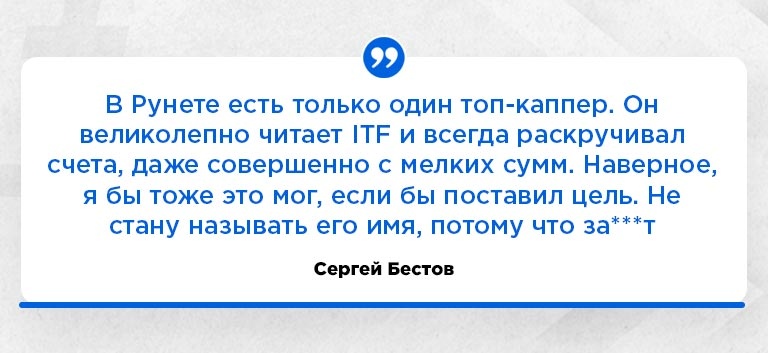 — Если честно, я только одного каппера могу назвать. Я впечатлен тем, как он умеет поднимать деньги. Может, я просто не сильно интересуюсь другими, не сильно слежу за тем, как они ставят. Этот один – тот самый ITF-ник, которому я даже несколько своих счетов отдавал для раскрутки и всякий раз, когда я ему их отдавал, он всегда раскручивал, даже совершенно с мелких сумм. Не знаю, как он это делает, но он великолепно читает ITF. Наверное, я бы тоже это мог делать, если бы поставил цель.