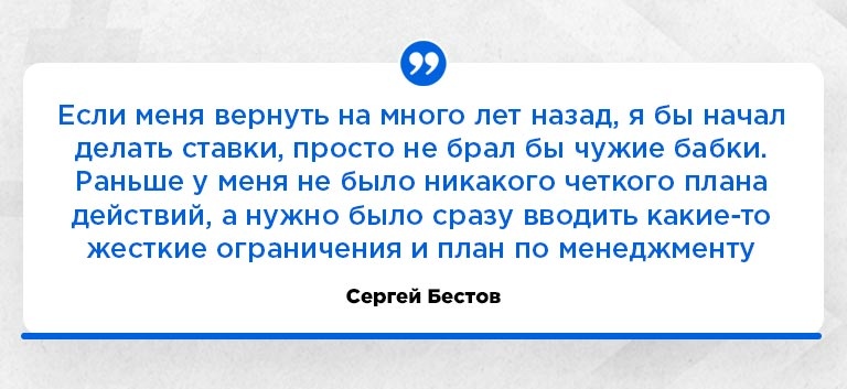— На этот вопрос я многократно отвечал. Я бы вернулся назад и не брал бы у людей деньги в долг, а так я не жалею, что начал делать ставки. Просто нужно было сразу вводить какие-то жесткие ограничения и план по менеджменту. У меня был единственный план – залить все бабки в контору и, может быть, если захочется, то когда-нибудь выводить.