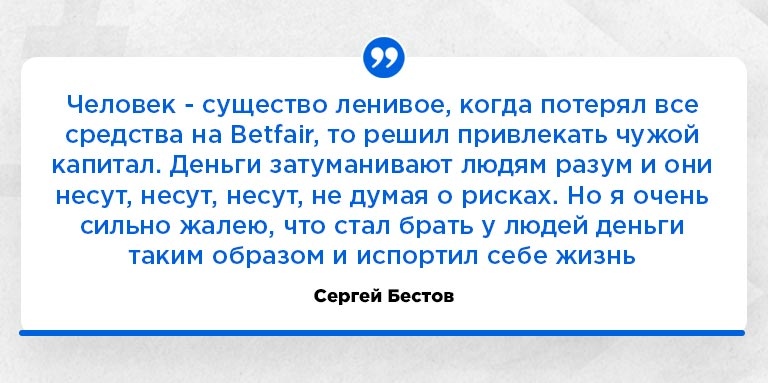 Я не скрываю, да, некоторым людям в припадках агонии говорил: "Ты же понимаешь, что рисков никаких нет. Ты можешь даже кредит брать смело и уверенно". Это я мог говорить человеку, встречаясь с ним в кафе, проиграв за час до этого 300 тысяч, но ему рисовал все в очень и очень радужных красках. Ну и люди вкладывались. Сначала один 100 тысяч вложил, я потерял часть его денег. Не знал, что делать, но через пару дней мне написала еще одна знакомая, которая вложила больше. Я сразу понял: "Ну все, теперь все будет нормально. Сейчас я по-быстренькому отобьюсь, ей верну, ему верну и все будет нормально". Но потом все это стало расти как снежный ком, для меня это стало делом привычки. К сожалению, это дурная привычка.