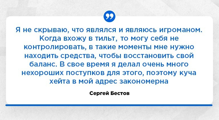 — Привет! Его всегда было много, учитывая специфику моей группы. У меня же не канал о ставках, а канал о моей жизни, которая пропитана разными событиями, в том числе не самыми приятными. Я не скрываю, что являлся и являюсь игроманом. Когда вхожу в тильт, то могу себя не контролировать, в такие моменты мне нужно находить средства, чтобы восстановить свой баланс. В свое время я делал очень много нехороших поступков для этого, поэтому куча хейта в мой адрес закономерна.