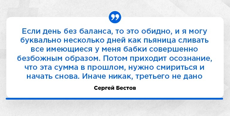 Если день без баланса, то это обидно, и я могу буквально несколько дней как пьяница сливать все имеющиеся у меня бабки совершенно безбожным образом, получая, например, 1200 с рекламы и помня, что у меня вчера было 100 тысяч. Я могу, прекрасно понимая, что это не пройдет, поставить 1200 на экспресс с коэффициентом 100. Я просто выкидываю бабки. Один день, другой, третий. Пытаюсь лесенкой с 1000 сделать 100 тысяч. Три недели назад у меня был период с сильным похмельем, когда я сливал 25 дней подряд разные суммы, в основном маленькие. Как я потом с этим борюсь? Свежий воздух помогает и время. Все равно потом приходит осознание, что эта большая сумма в прошлом, нужно смириться и начать снова с маленькой. Иначе никак, третьего не дано.