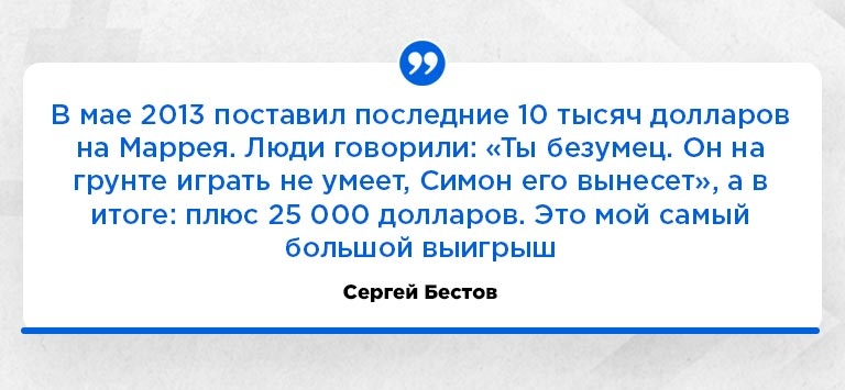 — У меня про это есть отдельный ролик "Самый крупный выигрыш в истории" или что-то такое. Это 9 мая 2013 года. Турнир в Риме. Я потерял часть денег до этого, у меня оставались последние 10 тысяч долларов. Тогда это вот так называлось, не последние 100 рублей, а последние 10 тысяч долларов. У меня было и 30 тысяч, и 40, но вот я скатился до 10. И поставил последнюю ставку на матч Маррей – Симон: победа Маррея. На грунте. Мне тогда еще сказали: "Ты безумец. Он на грунте играть не умеет, Симон его вынесет". За 3,5 я его взял, камбэк в матче. Он вел с брейком в решающем сете, потом брейк упустил, дело дошло до тай-брейка и там Симон ошибся при счете 6:6 с лета, Маррей выиграл 8:6. Плюс 25 тысяч долларов. Это был самый большой выигрыш в истории.