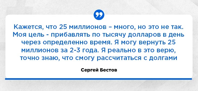 В принципе, я мог спокойно на все забить. Отдать долг этой Ольге Александровне, банкам и все, но я буду отдавать абсолютно всем. Я должен людям с процентами, так как я им обещал, но, думаю, что с каждым будем общаться, кого-то устроит возврат и основной суммы. Один человек мне говорил, например: "Я вкладывал свободные деньги. Я их прощаю, претензий не имею". С каждым будем находить подход, но самое главное – я ни от чего не отказываюсь