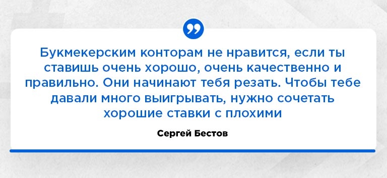 Но есть еще один момент – если ты ставишь очень хорошо, очень качественно и правильно, то букмекерским конторам это очень не нравится. Они тебя начинают резать. Они сразу видят, если ты ставишь очень хорошо. Когда я отдал свой счет в BetCity другу, на котором у меня был минус, то он там проставил всего три дня и даже не все ставки выиграли. Но они сразу поняли, что одна ставка там 10 тысяч на 2,3, другая 10 тысяч на 2,1. Они поняли, что он на дистанции их у***т. Они его заблокировали – порезали до десяти рублей за три дня буквально.