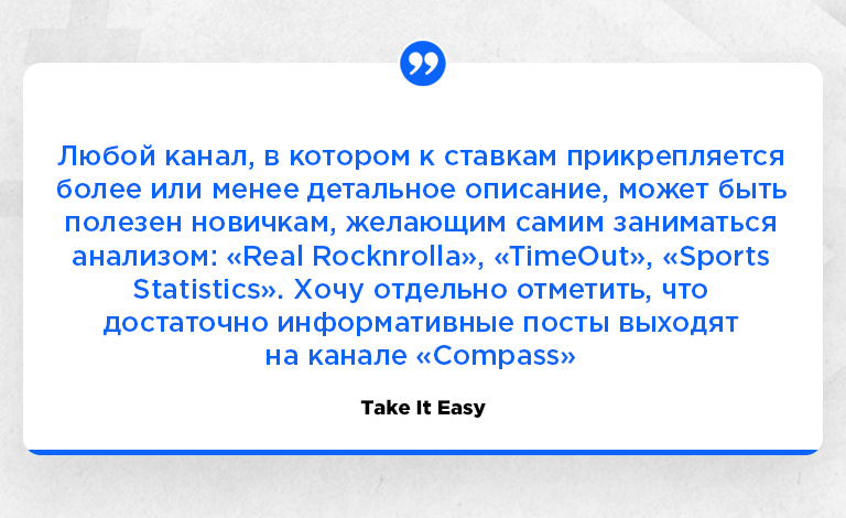 — Любой канал, в котором к ставкам прикрепляется более или менее детальное описание, может быть полезен новичкам, желающим самим заниматься анализом: "Real Rocknrolla", "TimeOut", "Sports Statistics".