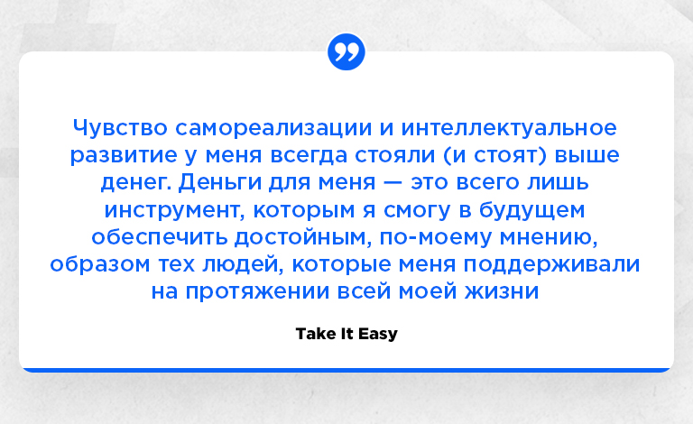 Во-вторых, чувство самореализации и интеллектуальное развитие у меня всегда стояли (и стоят) выше денег. Деньги для меня — это всего лишь инструмент, которым я смогу в будущем обеспечить достойным, по-моему мнению, образом тех людей, которые меня поддерживали на протяжении всей моей жизни.