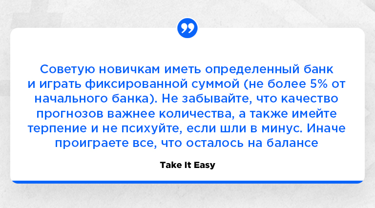 — Сейчас у меня не так много времени, чтобы ставить на свои прогнозы, но, когда я этим занимался, то ставил 5% от своего игрового банка, 5000 рублей.