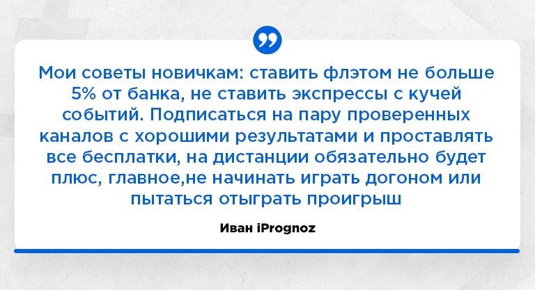 — Ставить флэтом не больше 5% от банка. Не ставить экспрессы с кучей событий. Подписаться на пару проверенных каналов с хорошими результатами и проставлять все бесплатки, на дистанции обязательно будет плюс, ничего страшного если вы словили пару минусов, главное не начинать играть догоном или пытаться отыграть проигрыш. Когда скопите достаточный банк (несколько десятков тысяч рублей), можно начинать покупать платные рассылки, предварительно подготовив необходимые счета для той или иной рассылки. Главное, подходить к ставкам с холодным расчетом и все получится. Звучит все очень тяжело, возможно, но здесь каждый может даже с 1000 рублей, со временем, действуя системно, соблюдая все эти правила, дойти до хорошего банка и начать зарабатывать.