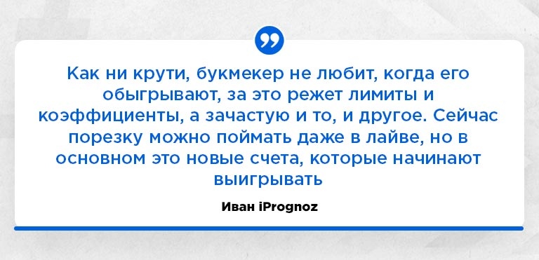 Порезки прилетают по разным причинам. В основном это новые счета, которые начинают выигрывать. Порезка может прилететь не только на смолах. Знаю случаи, когда люди ставили на биги 15 ставок по 100 рублей на новом счете, они все зашли и, пожалуйста, ловите порезку на следующий день. Также порезка может прилететь, когда букмекером была допущена сильная ошибка в росписи и на это массово поставили. Даже на прогретых старых счетах порезки не избежать, вопрос времени. Вывод тут один: как ни крути, букмекер не любит, когда его обыгрывают, за это режет лимиты или коэффициенты, а зачастую и то, и другое. Сейчас порезку можно поймать даже в лайве.