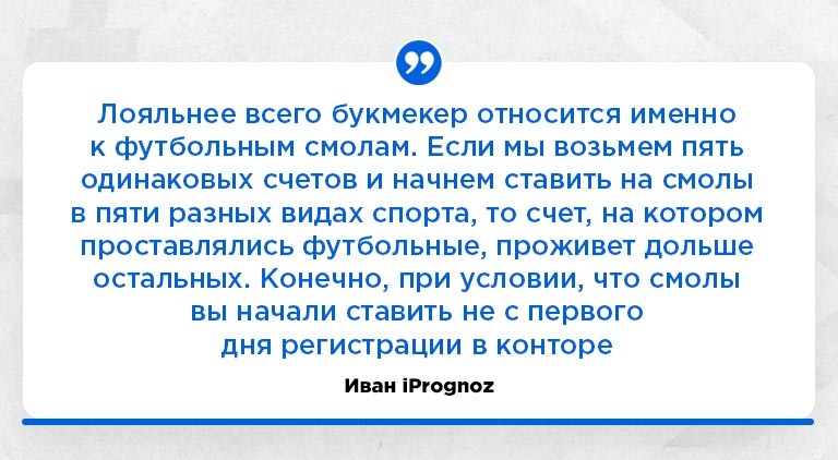 Букмекер относится к ставкам на футбольную статистику достаточно лояльно. Если мы возьмем пять одинаковых счетов и начнем ставить на смолы в пяти разных видах спорта, то счет, на котором проставлялись футбольные смолы, скорее всего, проживет дольше остальных. Конечно, при условии, что смолы вы начали ставить не с первого дня регистрации в конторе, это очень важно.