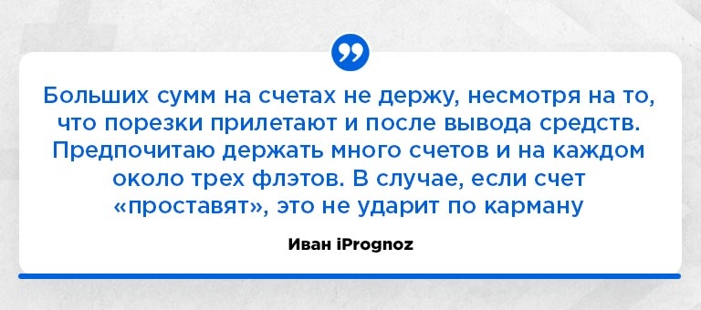 — Вывод средств делается по 15 000. Больших сумм я на счетах не держу, несмотря на то, что порезки прилетают и после вывода средств. Поэтому сложно сказать, сколько было выведено максимум с того или иного счета. Я предпочитаю держать много счетов и на каждом около трех флэтов. В случае, если счет "проставят", это не ударит по карману.