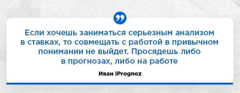 — По образованию — менеджер. Работал в продажах, в разных сферах — это была и недвижимость, и продукты; были строительные материалы. Я работал и после 25 лет. Полностью отказаться от работы мне удалось сравнительно недавно. Ставки давали хороший доход, но на тот момент недостаточный, чтобы уйти с работы. Да и многие, имея миллионные банки, продолжают работать. Это касается больше тех, кто только проставляет, конечно… Но если ты хочешь заниматься анализом, то совмещать с работой это почти невозможно, просядешь либо в прогнозах, либо на работе, в итоге "ничего не поймаешь".