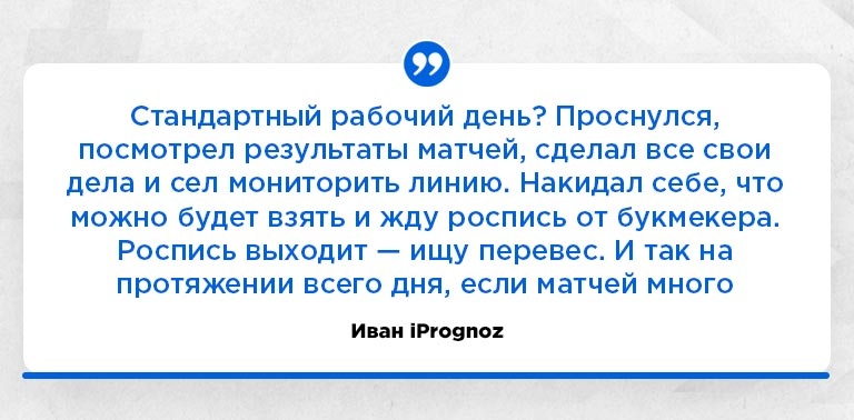 — Хах. Живу в съемной квартире с семьей. Думаем о строительстве дома, не без помощи ипотеки. Еще неизвестно сколько думать будем. Рабочий день — это проснулся, просмотрел результаты матчей, которые интересовали. Сделал все свои дела, какие успел, и сел мониторить линию. Накидал себе, что можно будет взять и жду роспись от букмекера. Роспись выходит — ищу перевес. И так на протяжении всего дня, если матчей много.