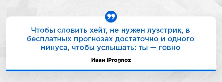 — В платке нет, не было особо. Там в основном все не первый день в ставках. По бесплатным прогнозам хейт бывает, и для этого необязателен лузстрик. Достаточно и один минус словить иногда, чтобы тебе кто-то высказал, что ты — говно.