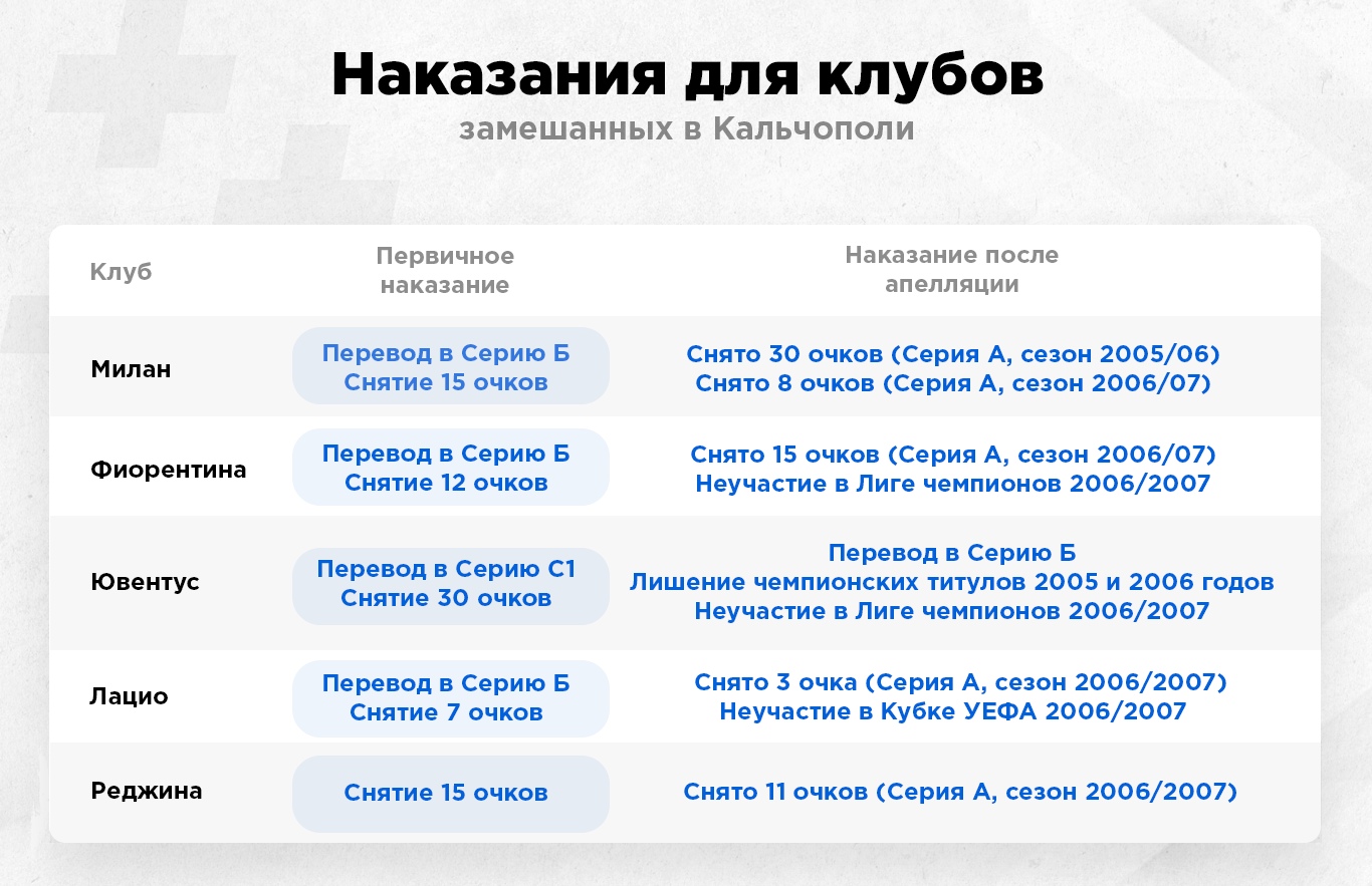 В так называемом "Кальчополи" кроме туринского клуба были замешаны "Фиорентина", "Милан", "Лацио" и "Реджина". В 2006 году итальянские службы раскрыли сговор между ними и футбольными судьями. "Ювентус" постарался больше всех, в частности их генеральный директор Лучано Моджи. С записи его телефонных разговоров и началась цепочка расследований.
