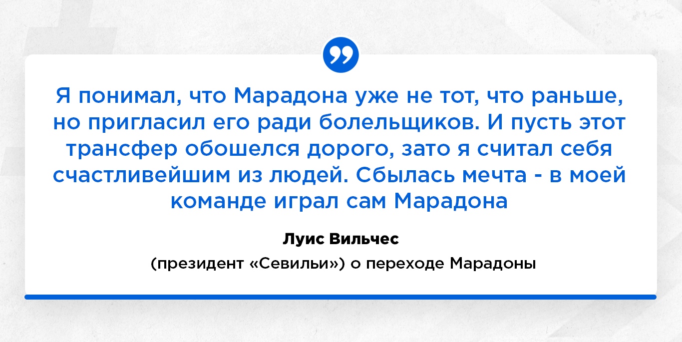 Когда закончилась первая дисквалификация, Марадона покинул “Наполи” и отправился в “Севилью”. Андалусийцы были типичным середняком, но Диего нужна была перезагрузка. Желательно, в команде попроще, где нет завышенных ожиданий. На приглашении Марадоны настоял Карлос Билардо – именно при нем аргентинцы выиграли ЧМ-1986, а Диего был главной звездой в той сборной. Билардо пришел в “Севилью” перед началом сезона. За Марадону выложили 7,5 млн долларов.
