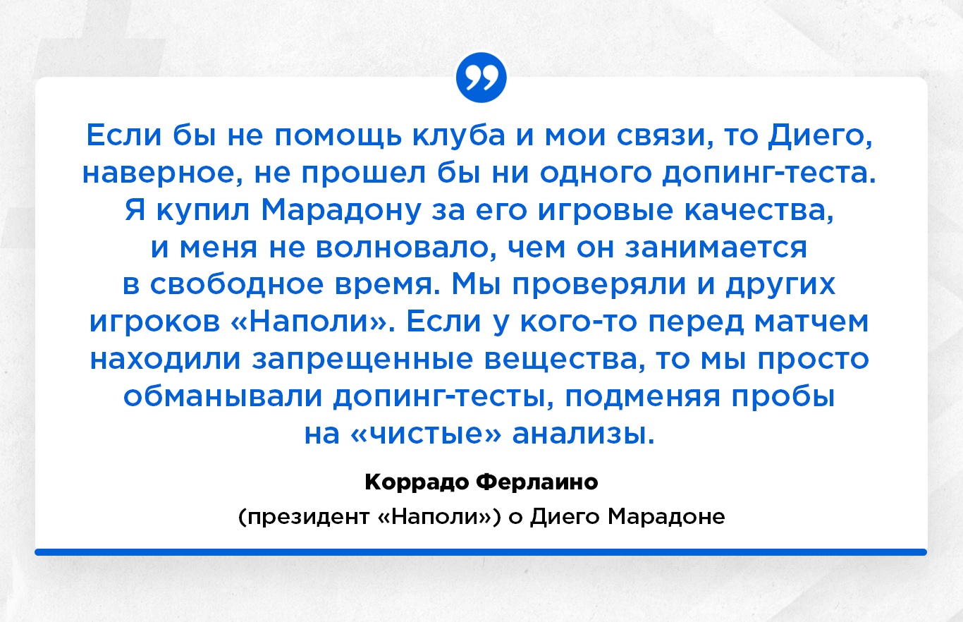 Все знают, что Марадона сидел на кокаине. Первую “дорожку” он попробовал еще будучи игроком “Барселоны”. Со временем баловство переросло в зависимость, от которой Диего не избавился, кажется, до сих пор. Кокаин, как и большинство наркотических веществ, входят в список запрещенных. Когда Марадона перешел в “Наполи”, то президент клуба помогал ему избегать допинг-тестов.