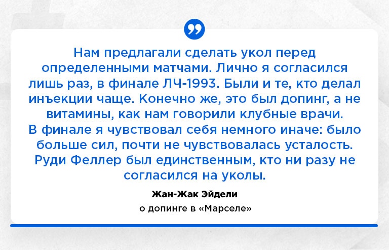 Через год – новый заход в Европу. "Марсель" без проблем прошел "Динамо" (Бухарест), а в группе ему попались "Рейнджерс", "Брюгге" и ЦСКА. Во Франции же главным соперником был "Монако", руководимый Арсеном Венгером. Тогда пошли слухи, что "Марсель" включил административный ресурс: подкупал судей и игроков противника, в то время как вся команда принимала допинг, который чудным образом не находили в пробах.