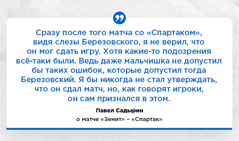 Сначала "Футбольный клуб", а затем и другие журналисты стали раздувать тему. В конечном итоге РФС решило проверить участников того матча. Павел Садырин, возглавлявший тогда "Зенит", предположил, что сдать игру мог именно Березовский.