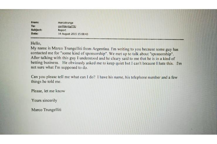 После этой встречи Марко улетел в Швейцарию к своему другу Йосу Эспасандину, рассказал о произошедшем, и вместе они решили, что лучше всего обо всем сообщить в TIU, организацию, которая борется с договорными матчами. В итоге они писали в TIU следующее письмо: