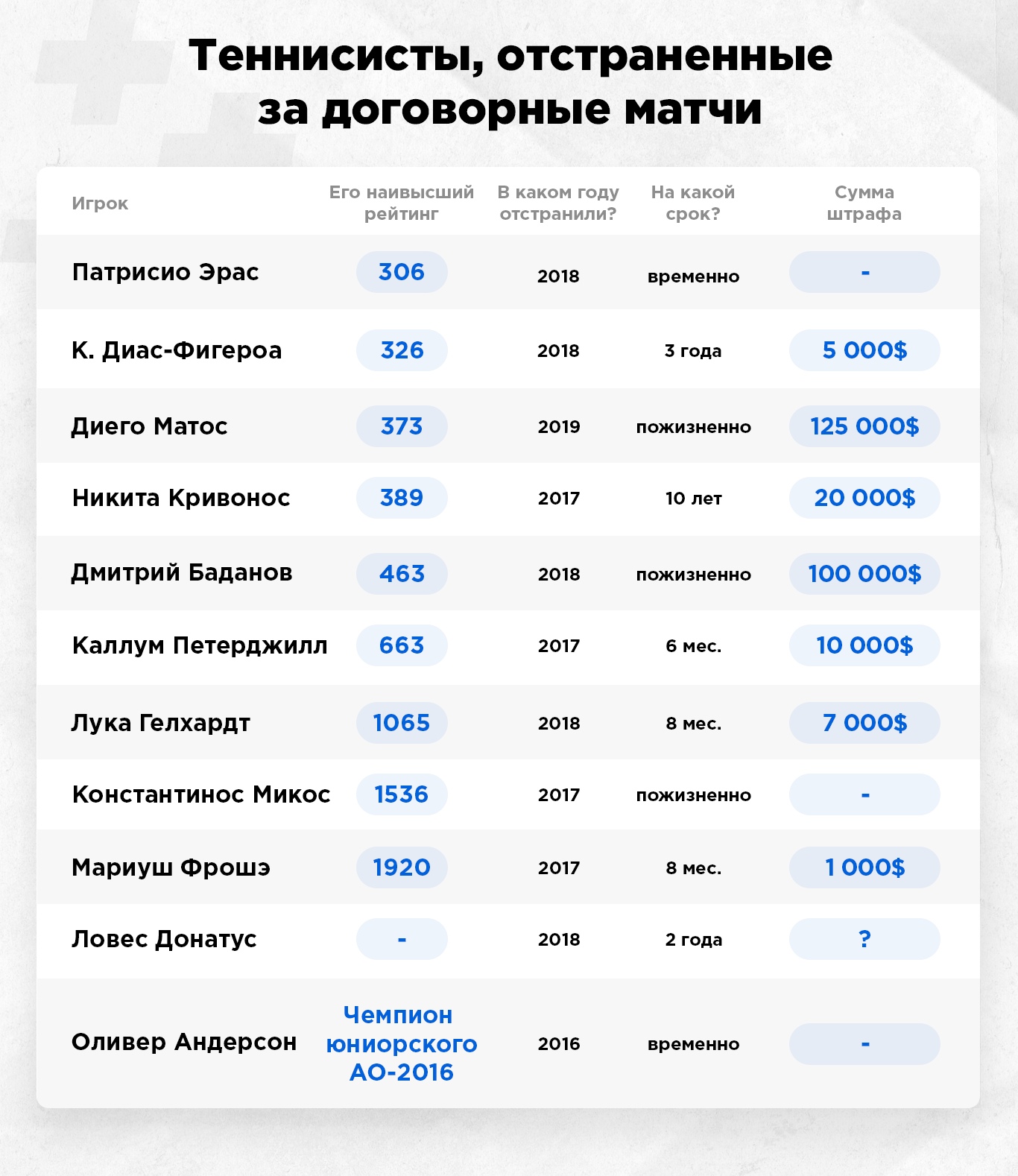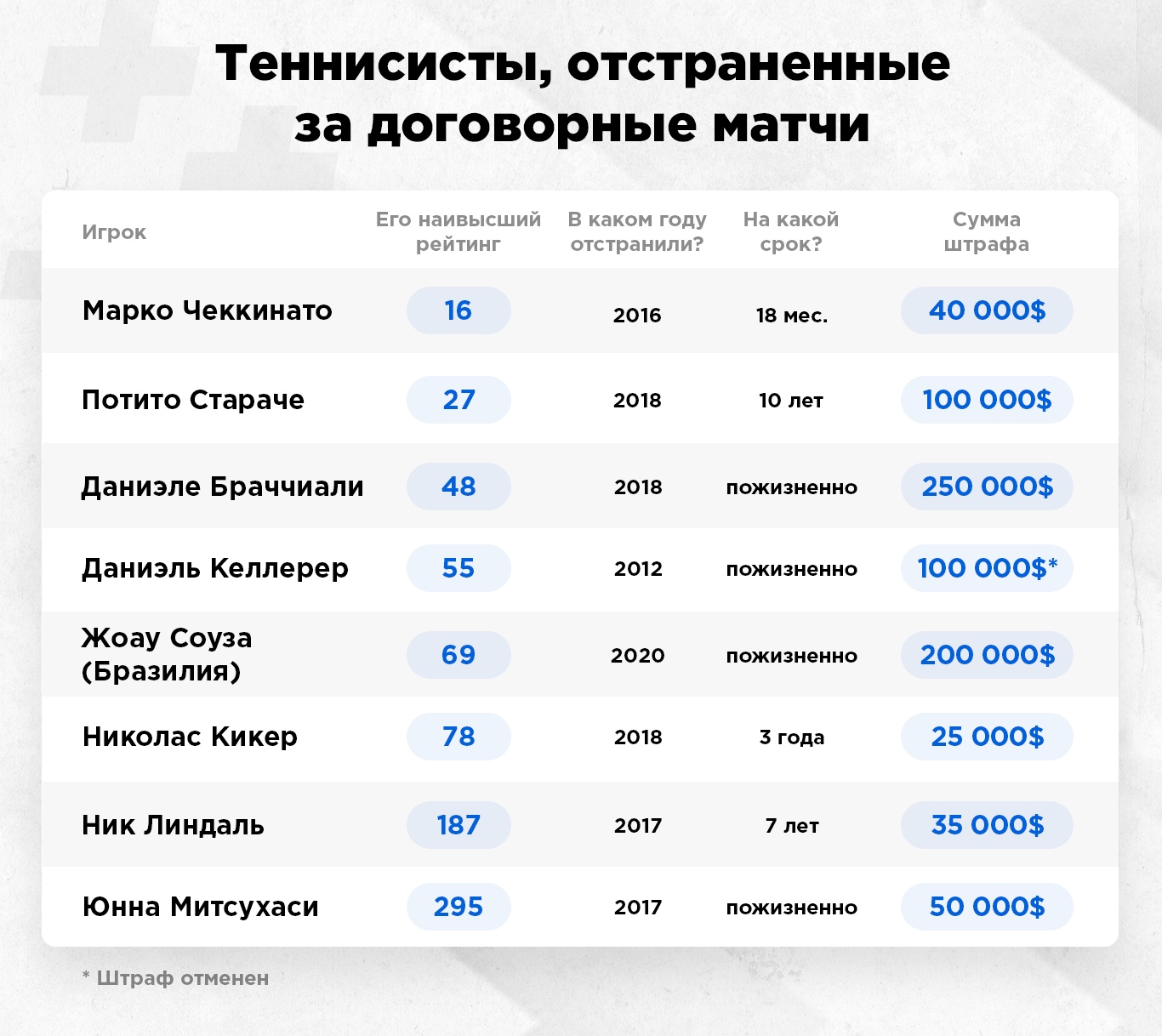 Пожалуй, стоит выделить из этого списка итальянского игрока Марко Чеккинато. В 2016-м году его отстранили от игр на 18 месяцев за сдачу матчу Камилу Майхшаку на Челленджере в Марокко в октябре 2015-го. Кроме того, итальянцу выписали штраф в целых $40 тыс., что является крупной суммой для игрока, который выступает только на Челленджерах. В тот период Марко выше 143-ей строчки рейтинга АТР не поднимался. Интересно, что два года спустя Чеккинато обыграл на "Ролан Гаррос" самого Новака Джоковича, выиграл несколько турниров АТР, а также смог стать 16-й ракеткой мира.