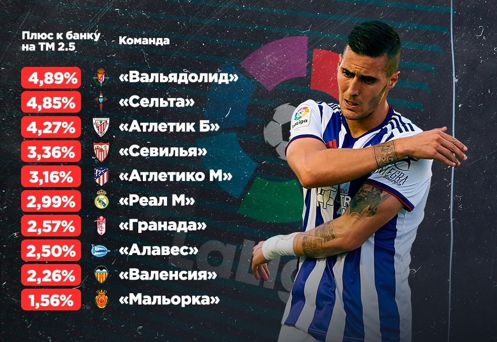 "Атлетико М" и "Атлетик Б" играют особо "сухо", а матчи "Вальядолида" и "Сельты" приносят наибольший профит при игре на ТМ 2.5;