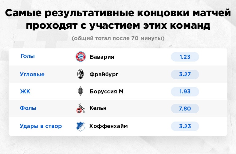 "Хоффенхайм" не является лучшей командой Бундеслиги по угловым и не входит даже в топ-5. Но все меняется, когда команда проигрывает в счете. "Сине-белые" в эти временные отрезки зарабатывают много угловых (7+ за 90 минут), но и сопернику позволяют также подавать их часто, поэтому общий тотал получается высокий. Только тренерские перестановки немного портят эту картину.