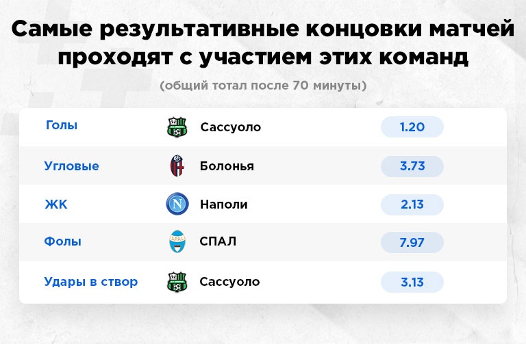 По "Сассуоло" и их результативности в целом всем все известно. Но для лайва на ТБ стоит лучше приметить "Дженоа". Эта команда является воплощением фразы "между первой и второй…". Если в матче забит гол - где-то тут скорее всего жди и следующий. В этом сезоне картина в целом сохраняется, можете мельком пробежаться посмотреть. Особенно много голов в матчах "Дженоа" забивается тогда, когда эта команда начинает проигрывать по ходу встречи.