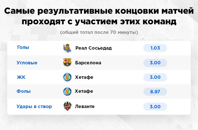 "Реал Сосьедад" попал сюда из-за своей статистической особенности. У них ничем не примечательная первая половина встречи с тоталом голов ниже среднего, но при этом самые результативные вторые таймы (0.93 гола и 1.73).