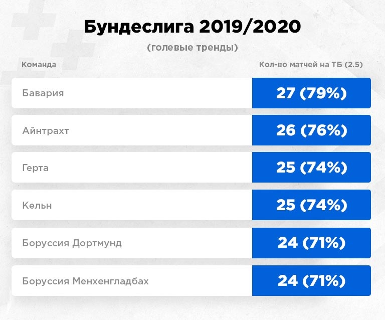 Большинство бетторов и без того любят ставить только на ТБ в Бундеслиге, но лучше делать это по трендам, а не вслепую. Минувший сезон породил много голевых закономерностей, а самое интересное – не было ни одной по-настоящему "низовой" команды. У каждого клуба было более 50% матчей на ТБ (2.5) голов. Реже других на "больше" играл "Вольфсбург" – всего 53% матчей (18 против 16-ти).