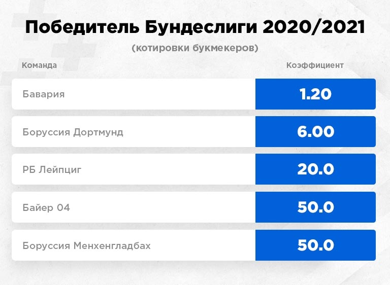 Перед началом сезона букмекеры выразили полную уверенность в том, что у "Баварии" просто нет конкурентов в борьбе за титул. После прихода Флика мюнхенцы и правда великолепны. Прошлый сезон принес им не только победу в чемпионате, но еще в Кубке Германии и Лиге чемпионов. В новой кампании "Бавария" будет стремиться защитить все титулы, но с этим могут возникнуть сложности. Алькантара готовится к переходу в "Ливерпуль", а на его место "Бавария" пока никого не присмотрела. Без испанца центр поля мюнхенского клуба может заметно сбавить по части креатива. "Боруссия" же обходится пока без потерь и продолжает работать над усилением.