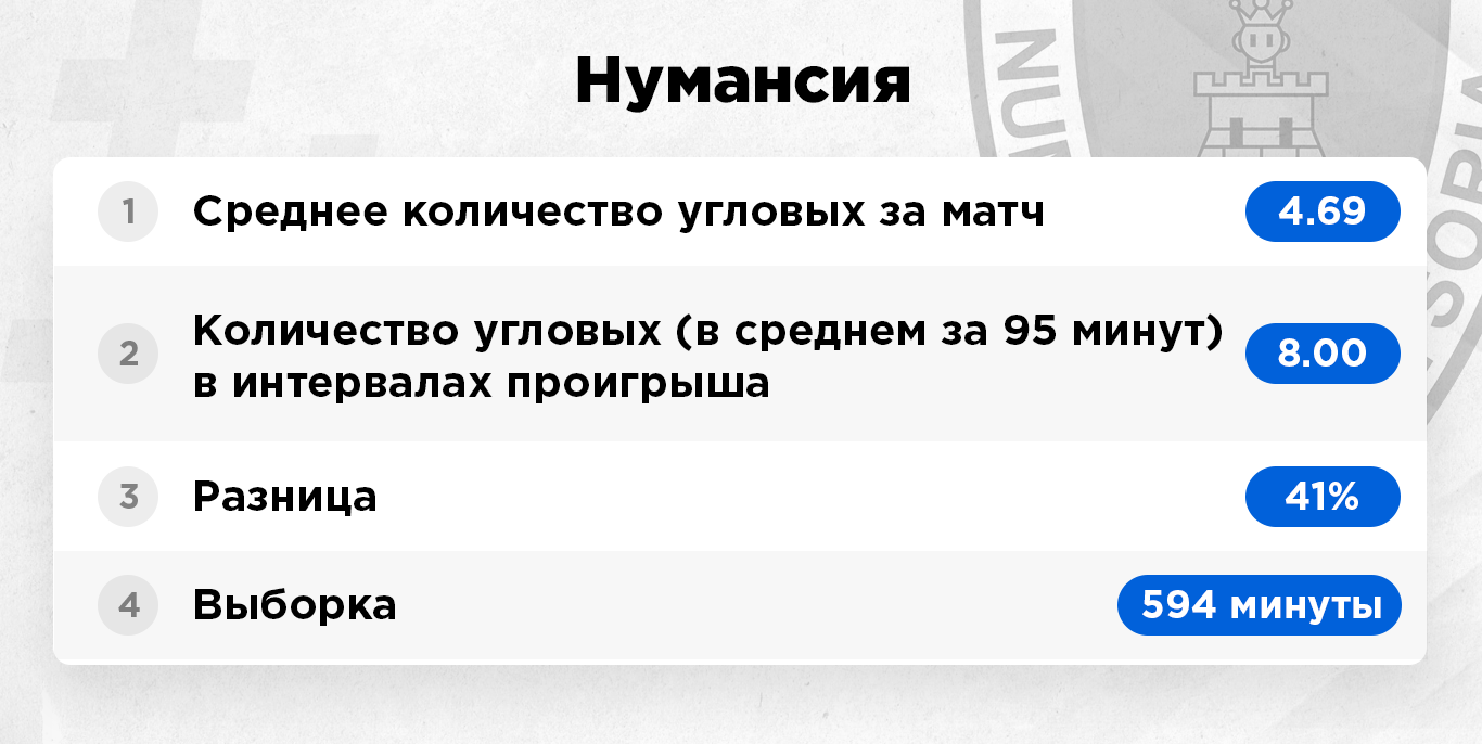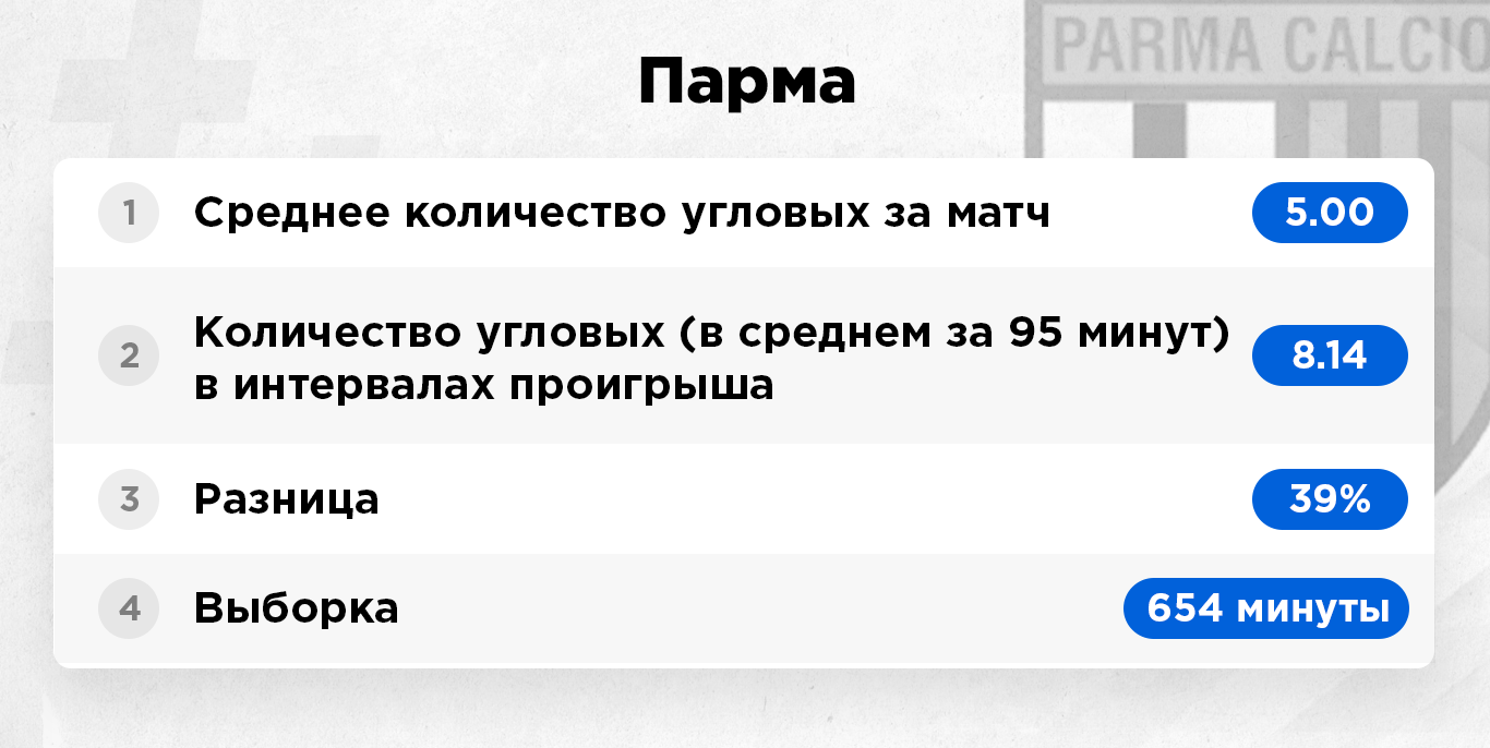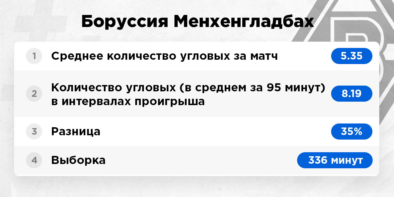 Интервалы проигрыша – это исключительно те отрезки матча, когда команда уступала в счете и была в роли догоняющей. Цифра берется усредненная за 95 минут игрового времени. То есть, к примеру, команда по ходу сезона 380 минут уступала в счете. Это примерно четыре полных матча. За это игровое время она подала 40 угловых, в пересчете на одну игру мы имеем в среднем 10 корнеров.