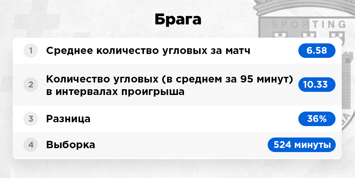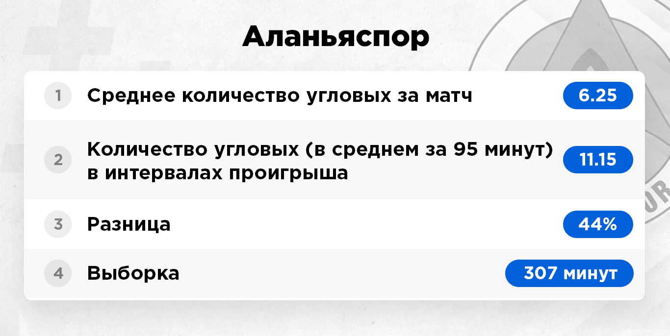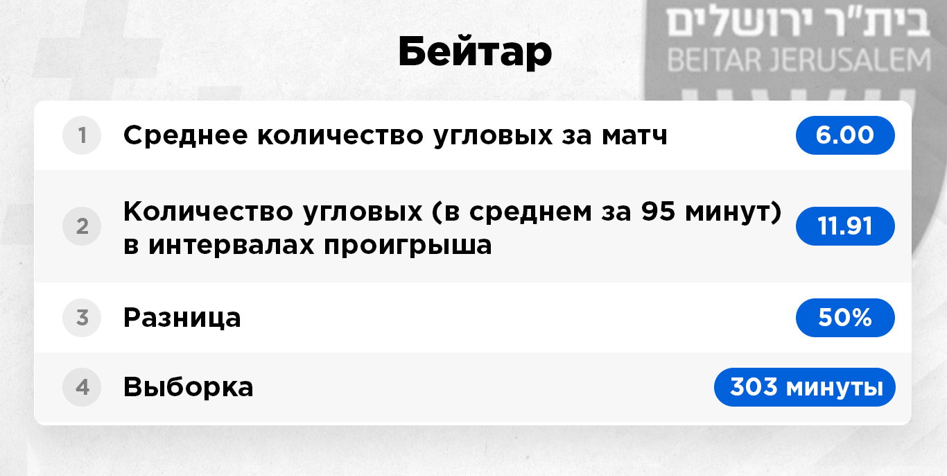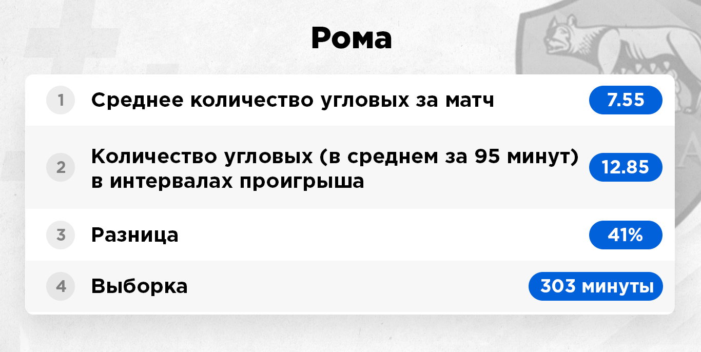 Интервалы проигрыша – это исключительно те отрезки матча, когда команда уступала в счете и была в роли догоняющей. Цифра берется усредненная за 95 минут игрового времени. То есть, к примеру, команда по ходу сезона 380 минут уступала в счете. Это примерно четыре полных матча. За это игровое время она подала 40 угловых, в пересчете на одну игру мы имеем в среднем 10 корнеров.