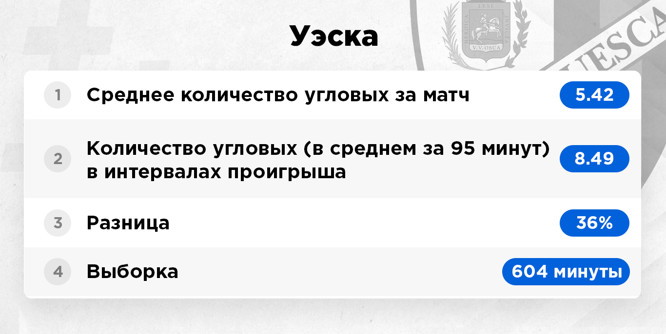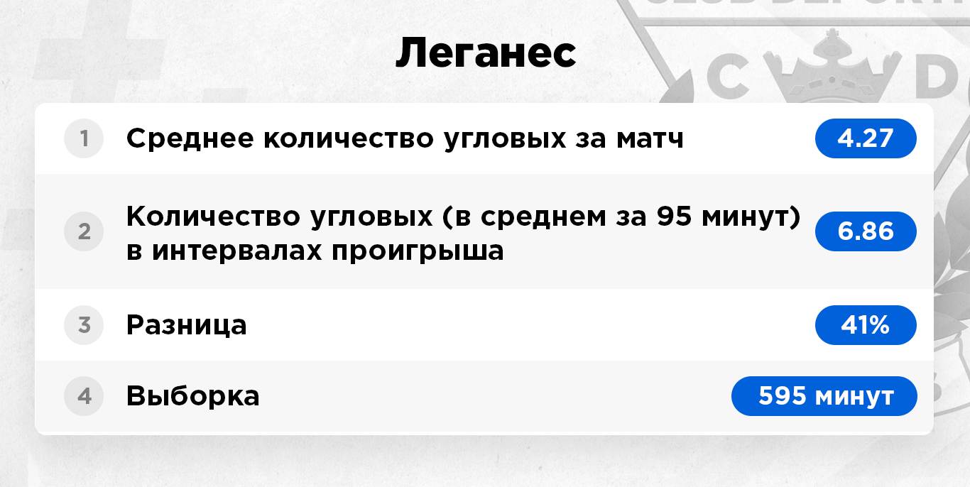 Обратите внимание, в интервалах проигрыша "Леганес" – третья команда лиги по угловым. При обычных условиях она третья с конца.