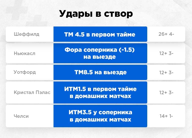 Также стоит отметить, что “Шеффилд” подавал больше 3.5 угловых в 12-ти из 13-ти матчей против команд из верхней части турнирной таблицы, меньше четырех для них - редкость, вне зависимости от соперника. В первом круге выиграли у МЮ 6:3. Фактор домашнего поля сейчас менее значим, что тоже на руку такой ставке. Ну и просто средние цифры за последние 20 матчей: “Шеффилд” - 5.60, соперники МЮ - 6.