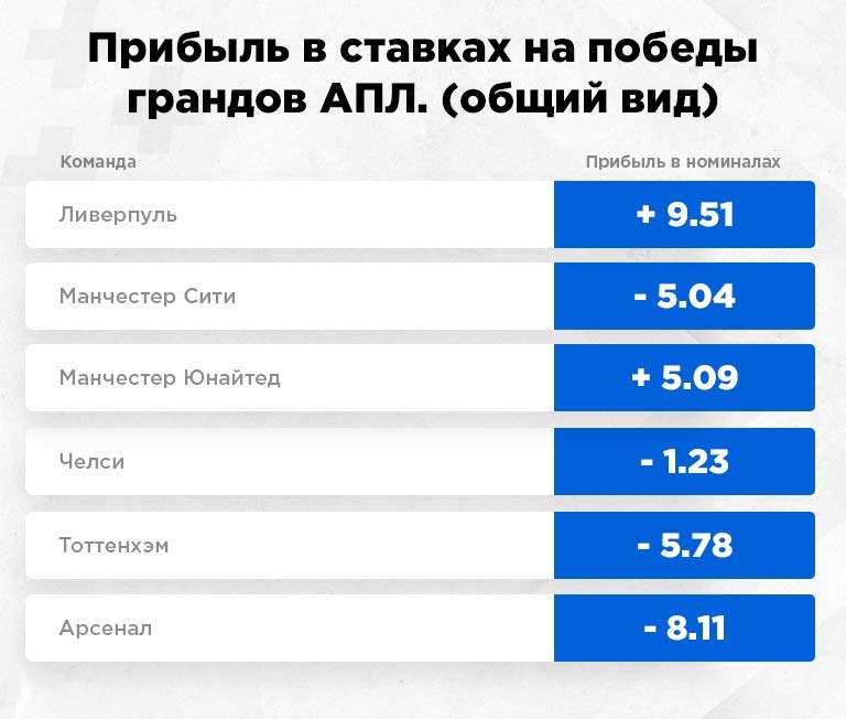 Подводя итоги, будет правильно вынести "Лестер Сити" за скобки. Несмотря на свои успехи в минувшем сезоне, эта команда не обладает статусом гранда. Лишь немногие до начала кампании могли рассматривать вариант с регулярными ставками на ее победы. Поэтому еще раз взглянем на итоги ставок в пользу побед каждого из шести грандов АПЛ.