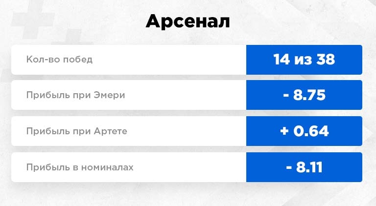Что же касается ставочных итогов "Арсенала" в чемпионате, то они убыточны. Правда, как и в случае с другим клубом Северного Лондона, после смены главного тренера можно было немного заработать. Делая ставки на победу "канониров" при Эмери, вы бы потеряли 8.75 номиналов. После его ухода пари на победу лондонской команды принесли бы вам 0.64 номинала. Но стоит обратить внимание, на то, что важную роль в этом сыграла победа "Арсенала" над лишенном мотивации "Ливерпулем" в одном из последних туров чемпионата. Коэффициент на это событие равнялся 4.57.