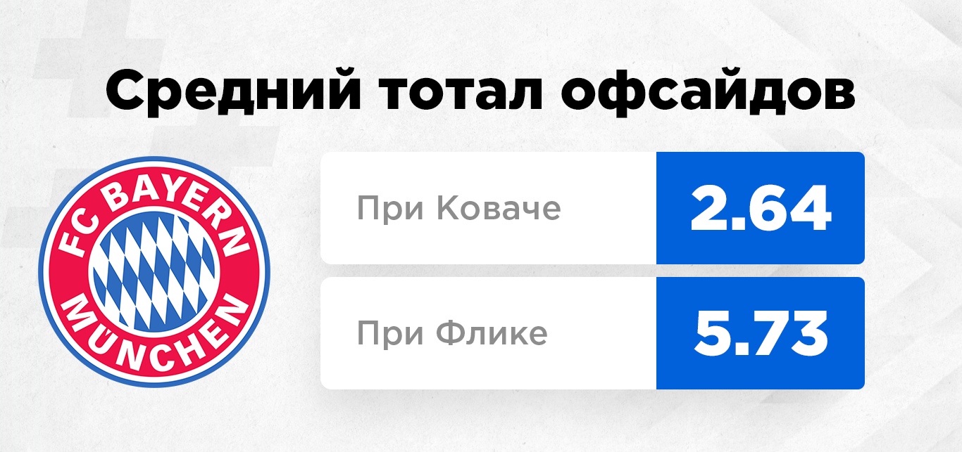 Резко и ощутимо поднялся средний тотал офсайдов во встречах с участием "Баварии". При Коваче было 2.64 за игру, при Флике стало 5.73. В итоге мы имеем по сезону среднюю цифру 3.89, но с новым тренером в 10 из 11 матчей "Баварии" пробивался тотал 3.5 офсайдов.